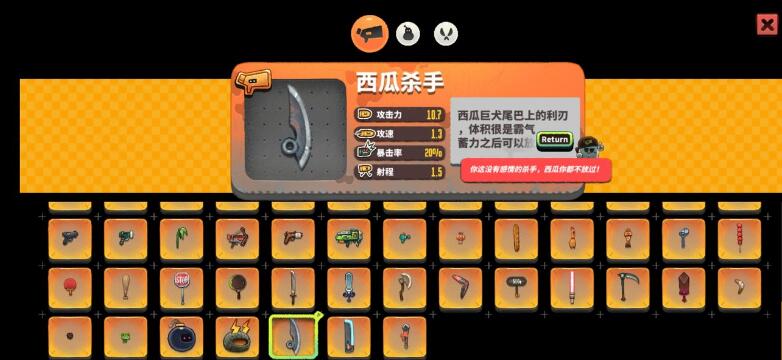 西瓜杀手是近战远程类武器,在第一关的西瓜boss打完之后可以解锁,但概率很低,玩家想要的话,可以多刷几次。西瓜杀手的特点是在近战中可以挡子弹,同时蓄力之后可以远程打击,适合放风筝打法或者蓄力之后贴脸乱砍。