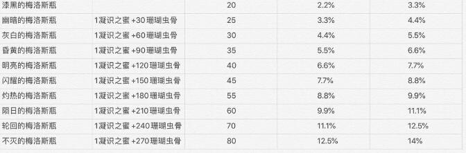 梅洛斯瓶一共有十个阶段的不同形态,最初的梅洛斯瓶是漆黑的梅洛斯瓶,合成需要1各凝识之蜜和30各珊瑚虫骨,可以增加20的攻击和2.2%的暴击率以及3.3%的暴击伤害,随着阶段的升级,需要更多的珊瑚虫骨,三项属性值也会逐步的增加其中最高阶段的瓶子可以增加80的攻击和12.5%的暴击和14%的暴击伤害。