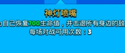 吉恩的随身妙具是神灯喷嘴,是一个吉恩的保命的随身妙具,效果是可以恢复吉恩的生命值,并且击退身边的所有的敌人,吉恩的大招可以将敌人吸到身边,但是如果抓错的话,还是很难受的。