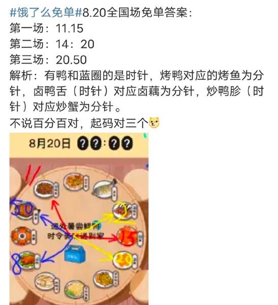 图中有鸭、烤、卤、炒等字,都是圈起来的,这些都是答案的重要元素。其中,鸭和蓝圈都是时针值,烤鸭对应的烤鱼是分针,第一时间8:50;卤鸭舌对应的卤藕2:20,最后11:15炒鸭胗。