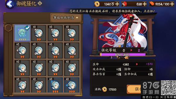 星级越高,得到的经验也就越多,测试4星青吉鬼,可以获得8750的强化经验。可以把一个6星御魂从0级升到2级,性价比极低~