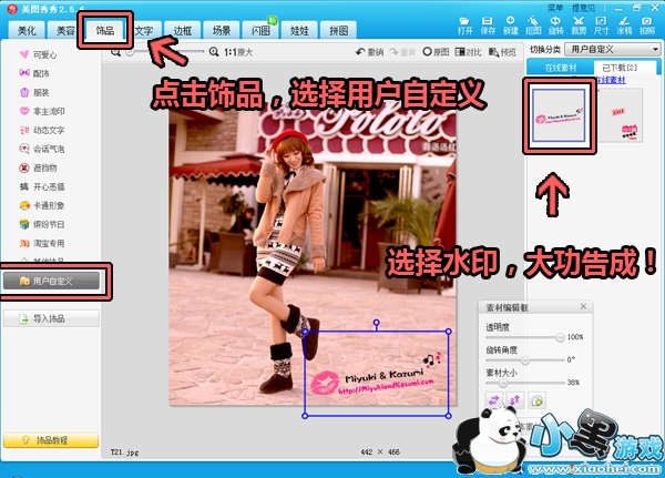 第二步:使用水印。用美图秀秀处理图片时,切换到“饰品”窗口,在窗口左侧饰品分类中选择“用户自定义”,在窗口右侧单击上一步导入的水印,即可为图片打上个性化的烙印(如图6)。
