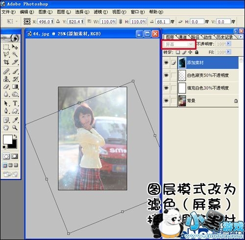 5、 多数星辰或是炫光图片都市是深黑色的底色,在这里选择调整图层模式为"滤色(屏蔽)"如此黑色部门就会隐藏了,接着就可以自由变换(Ctrl+T)来调整素材的角度和大小了,如图5所示。