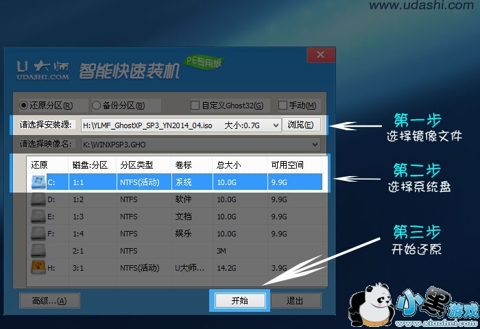 1、进入win8pe后桌面图标会自行跳动三次,U大师快速装机便会自动弹出,如果没有自动弹出,读者可以点击运行桌面上的“U大师一键快速安装”,下图所示是安装ghost版本的系统,首先我们点击浏览,在U盘找到我们下载好的ghost xp的iso或者gho文件,然后看一下C盘的可用空间,安装ghost xp的话小编建议C盘空间30G,然后点一下C盘,点击开始。
