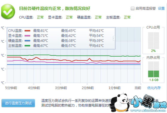 说法四:温度压力:主要是把cpu利用提升到100% 然后监测个硬件温度。进行压力测试的时候,你可以直接电脑监测里看各硬件的温度信息 ,你主要就是注意温度的变化。这个测试是不会自动结束,会让你的机子一直满载然后你可以观察温度,关闭那两个窗口就能停止,通常满载10分钟或者以上就能反映问题了。
