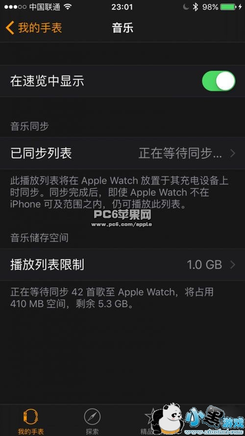 一般情况下,播放列表的音乐容量限制默认是 1GB,最高可以选择 2GB,并在 iPhone 下方显示已使用空间。另外,当被选取的 iPhone 端播放列表的歌曲有更新时,Apple Watch 也会同步更新。
