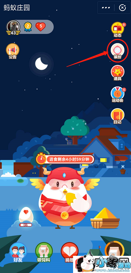 首先我们打开自己的蚂蚁庄园,然后点击右上角的装扮,如图所示