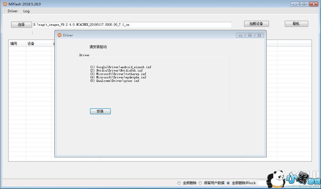 运行XiaoMiflash.exe后会提示安装驱动,如未提示安装点击左上角的Driver即可如下图: