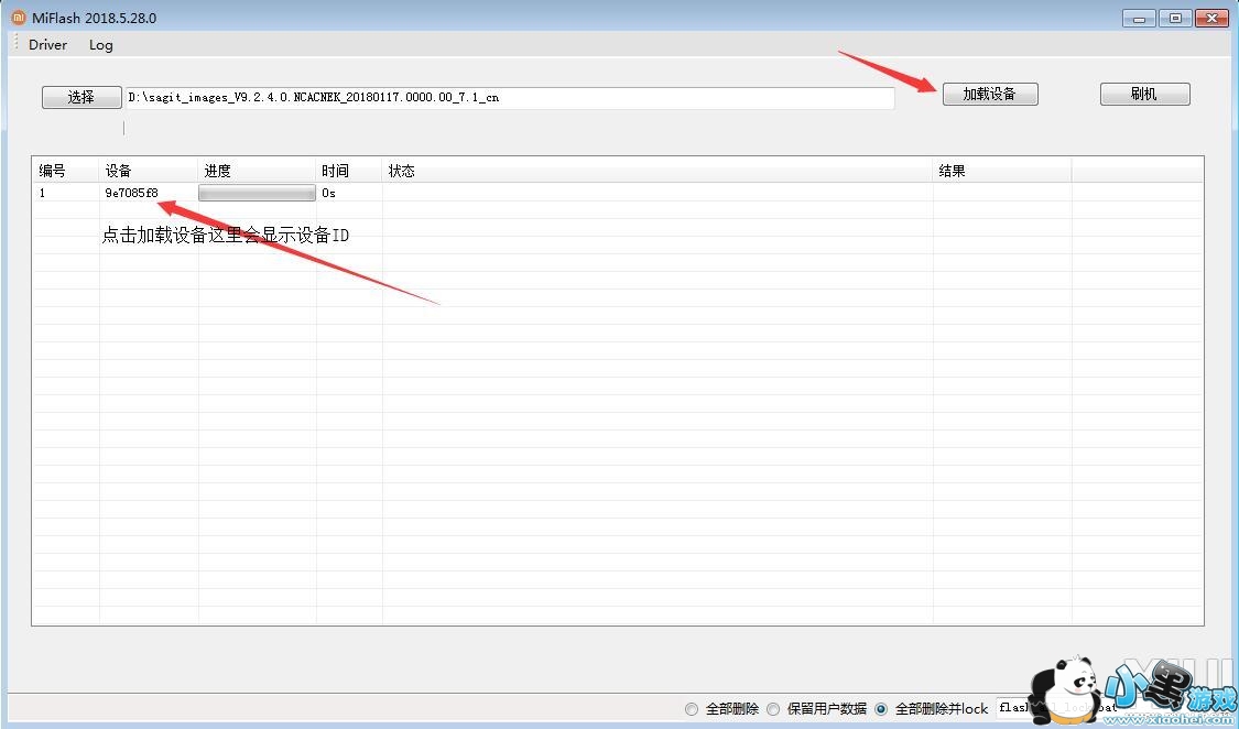 4.手机重启按住音量减键进入FASTBOOT模式,打开刚才下载的刷机工具XiaoMiflash.exe,点击左上角的选择,选择刚才下载的MI6解压的刷机包文件夹,也可以复制文件夹路径到选择框,右下角有是那个选择框,第一个是全部删除不上锁,第二个是保留数据,最后一个是全部删除并刷机完成后自动上BL锁