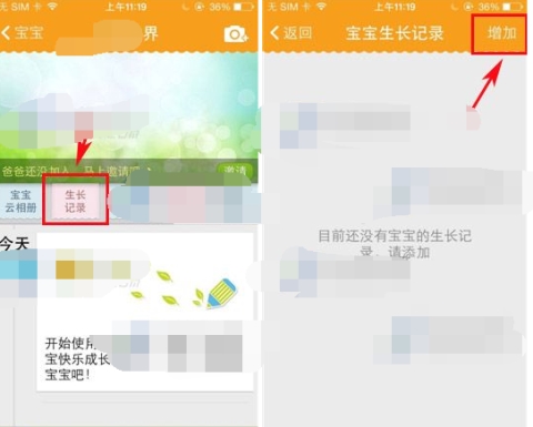 1、首先打开APP,点击【生长记录】,点击【增加】。