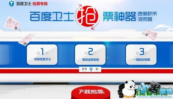 2.随着2017春节和寒假即将到来,春运抢票热潮再次席卷而来,针对火车票一票难求的迫切需求,百度旗下的安全软件“百度卫士”正式推出了“百度卫士抢票专版”,专为2017年春运打造,用户下载百度卫士抢票版后,只需经过“填写购票信息、一键抢票、快捷支付”简单三步即可完成整个订票过程,是一款必备抢票神器啊。