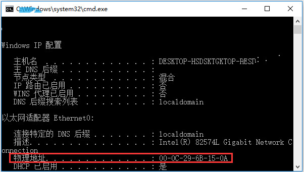 4、运行CMD,键入命令ipconfig/all复制你的MAC地址,比如我的MAC地址是000C296B150A