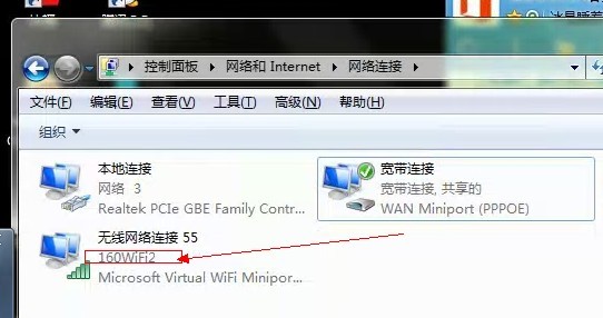 3、正常的情形应该如下图所示,“无线网络连接”图标下方应该会显示在160WiFi中设置的无线网络名称。